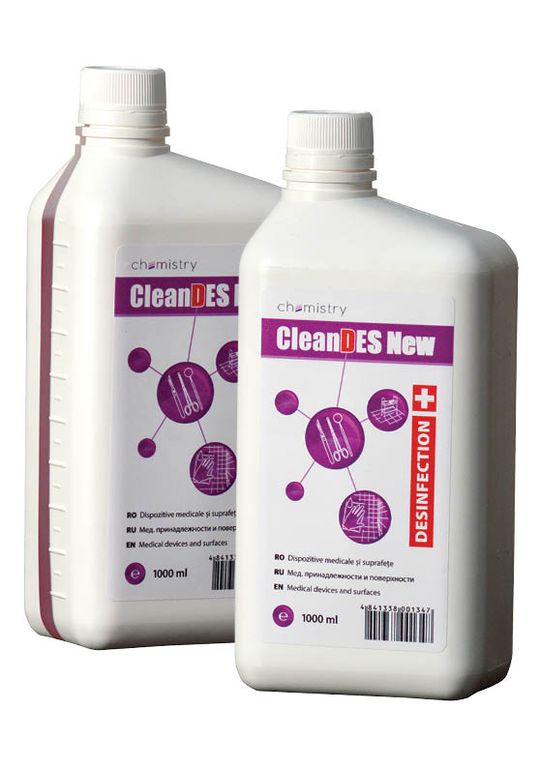 1.1 CLEAN DES NEW представляет собой жидкий концентрат, не содержащий фосфатов, содержащий в своем составе четвертичные аммониевые соединения, додецилдиамин хлорид, спирт, неионогенные ПАВы и ингибитор коррозии. Растворим в воде. Предназначен для мойки и дезинфекции поверхностей и медицинского оборудования.