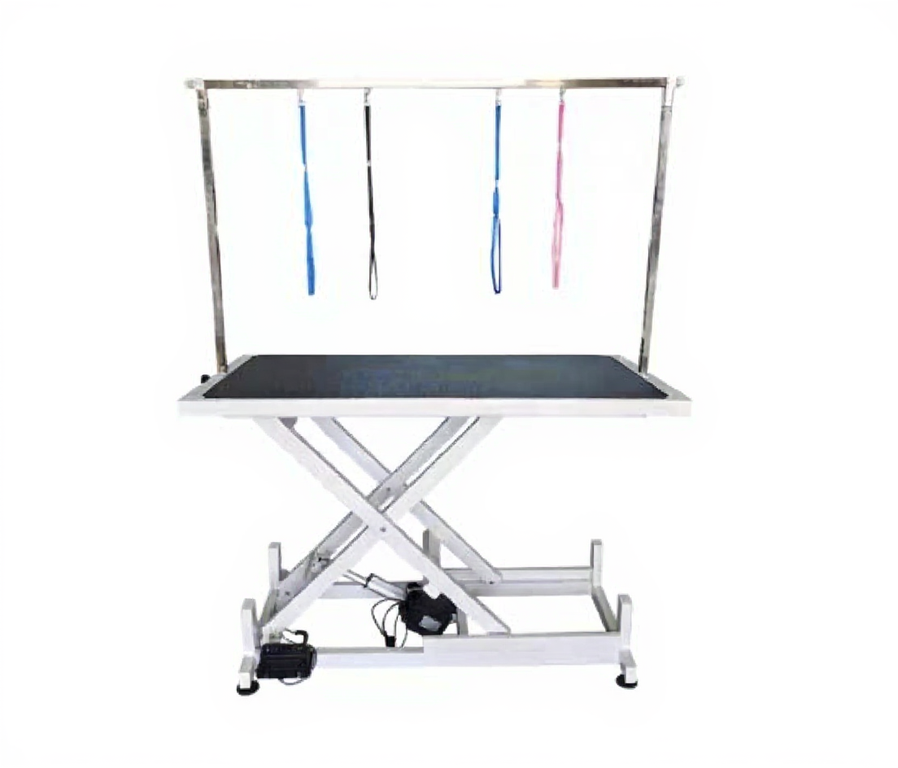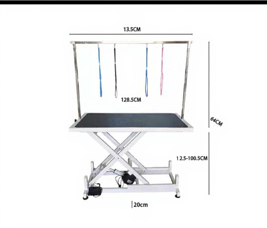 Masa este echipată cu motor electric, care permite reglarea lină a înălțimii blatului între 28 cm și 96 cm, asigurând confortul groomerului și siguranța animalului.